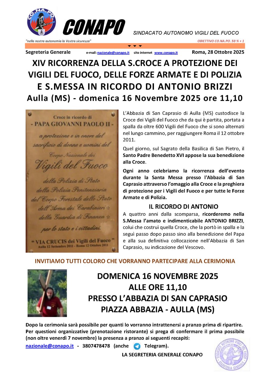 HomeBacheca Sindacale14° ricorrenza della Croce dei Vigili del Fuoco e S. Messa in ricordo di Antonio Brizzi – Abbazia di San Caprasio Aulla (MS) – domenica 16/11/2025.