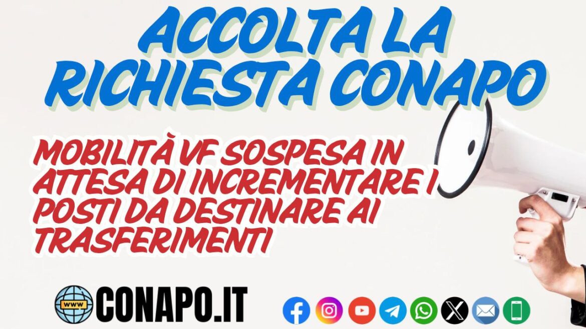Accolta la richiesta Conapo – mobilità VF sospesa in attesa di incrementare i posti da destinare ai trasferimenti. da Redazione_Conapo 11 Marzo 2025 11 Marzo 2025 751 Leggi la nota Scarica il PDF Stampa Condividi 0 FacebookTwitterPinterestWhatsappTelegramEmail Potrebbe piacerti anche Pubblicazione graduatorie finali – Concorsi pubblici a 7 posti per l’accesso alla qualifica di... 5 Dicembre 2025 Screening oncologico e cardiovascolare per il personale in servizio e in quiescenza. 4 Dicembre 2025 Il Governo incontra Forze Armate, Comparto Sicurezza e Soccorso Pubblico. 4 Dicembre 2025 Buona Santa Barbara. 4 Dicembre 2025 Avvio 103° corso Allievi Vigili del Fuoco 3 Dicembre 2025 Procedura di selezione per 18 posti di specialista di aeromobile vigile del fuoco per... 3 Dicembre 2025 post precedente Riscatto ai fini del TFS dei periodo da VD – VFB – VFP – riposta a nota CONAPO. prossimo post Vigili del Fuoco, il Conapo a palazzo Ducale: “Sbloccare la vendita della Caserma di Lucca” (NOITV).