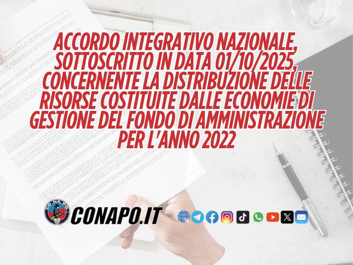 Accordo concernente la distribuzione delle risorse costituite dalle economie di gestione del Fondo di Amministrazione per l’anno 2022. da Redazione_Conapo 22 Ottobre 2025 22 Ottobre 2025 691 Accordo Integrativo Nazionale, sottoscritto in data 01/10/2025, concernente la distribuzione delle risorse costituite dalle economie di gestione del Fondo di Amministrazione per l’anno 2022. Leggi la nota Scarica il PDF Stampa Condividi 0 FacebookTwitterPinterestWhatsappTelegramEmail Potrebbe piacerti anche Screening oncologico e cardiovascolare per il personale in servizio e in quiescenza. 4 Dicembre 2025 Il Governo incontra Forze Armate, Comparto Sicurezza e Soccorso Pubblico. 4 Dicembre 2025 Buona Santa Barbara. 4 Dicembre 2025 Avvio 103° corso Allievi Vigili del Fuoco 3 Dicembre 2025 Procedura di selezione per 18 posti di specialista di aeromobile vigile del fuoco per... 3 Dicembre 2025 Avviso relativo alla “prova pratica tecnica” per l’accertamento dei requisiti attitudinali della selezione interna... 2 Dicembre 2025 post precedente Concorso pubblico a 52 posti da ispettore logistico gestionale del Corpo nazionale dei vigili del fuoco. prossimo post Accordo concernente la distribuzione delle risorse costituite dalle economie di gestione del Fondo di Produttività per l’anno 2022.
