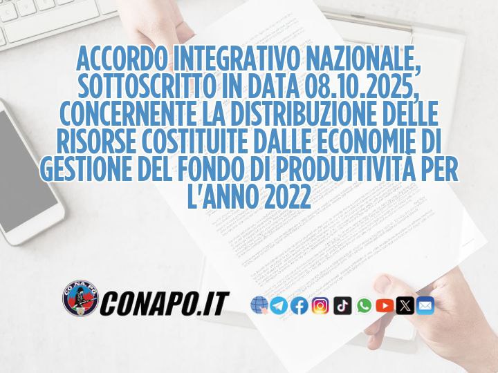 Accordo concernente la distribuzione delle risorse costituite dalle economie di gestione del Fondo di Produttività per l’anno 2022. da Redazione_Conapo 22 Ottobre 2025 22 Ottobre 2025 1,1K Accordo Integrativo Nazionale, sottoscritto in data 08.10.2025, concernente la distribuzione delle risorse costituite dalle economie di gestione del Fondo di Produttività per l’anno 2022 Leggi la nota Scarica il PDF Stampa Condividi 0 FacebookTwitterPinterestWhatsappTelegramEmail Potrebbe piacerti anche Screening oncologico e cardiovascolare per il personale in servizio e in quiescenza. 4 Dicembre 2025 Il Governo incontra Forze Armate, Comparto Sicurezza e Soccorso Pubblico. 4 Dicembre 2025 Buona Santa Barbara. 4 Dicembre 2025 Avvio 103° corso Allievi Vigili del Fuoco 3 Dicembre 2025 Procedura di selezione per 18 posti di specialista di aeromobile vigile del fuoco per... 3 Dicembre 2025 Avviso relativo alla “prova pratica tecnica” per l’accertamento dei requisiti attitudinali della selezione interna... 2 Dicembre 2025 post precedente Accordo concernente la distribuzione delle risorse costituite dalle economie di gestione del Fondo di Amministrazione per l’anno 2022. prossimo post Legge di bilancio e vigili del fuoco, rassegna stampa delle dichiarazioni Conapo.