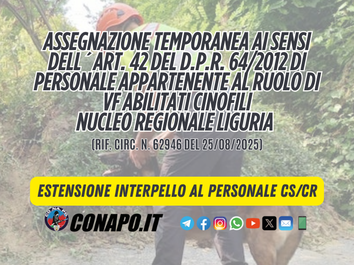Assegnazione temporanea ai sensi dell’art. 42 del D.P.R. 64/2012 di unità cinofile presso il Nucleo Cinofilo Liguria (rif. circ. n. 62946 del 25/08/2025) – Estensione interpello al personale CS/CR.