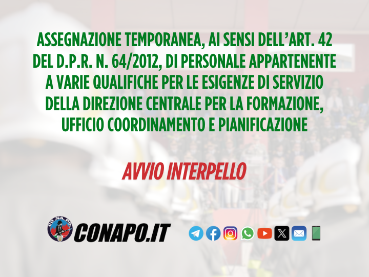 Assegnazione temporanea, ai sensi dell’art. 42 del D.P.R. n. 64/2012, di personale appartenente a varie qualifiche per le esigenze di servizio della Direzione Centrale per la Formazione, Ufficio Coordinamento e Pianificazione. – Avvio Interpello