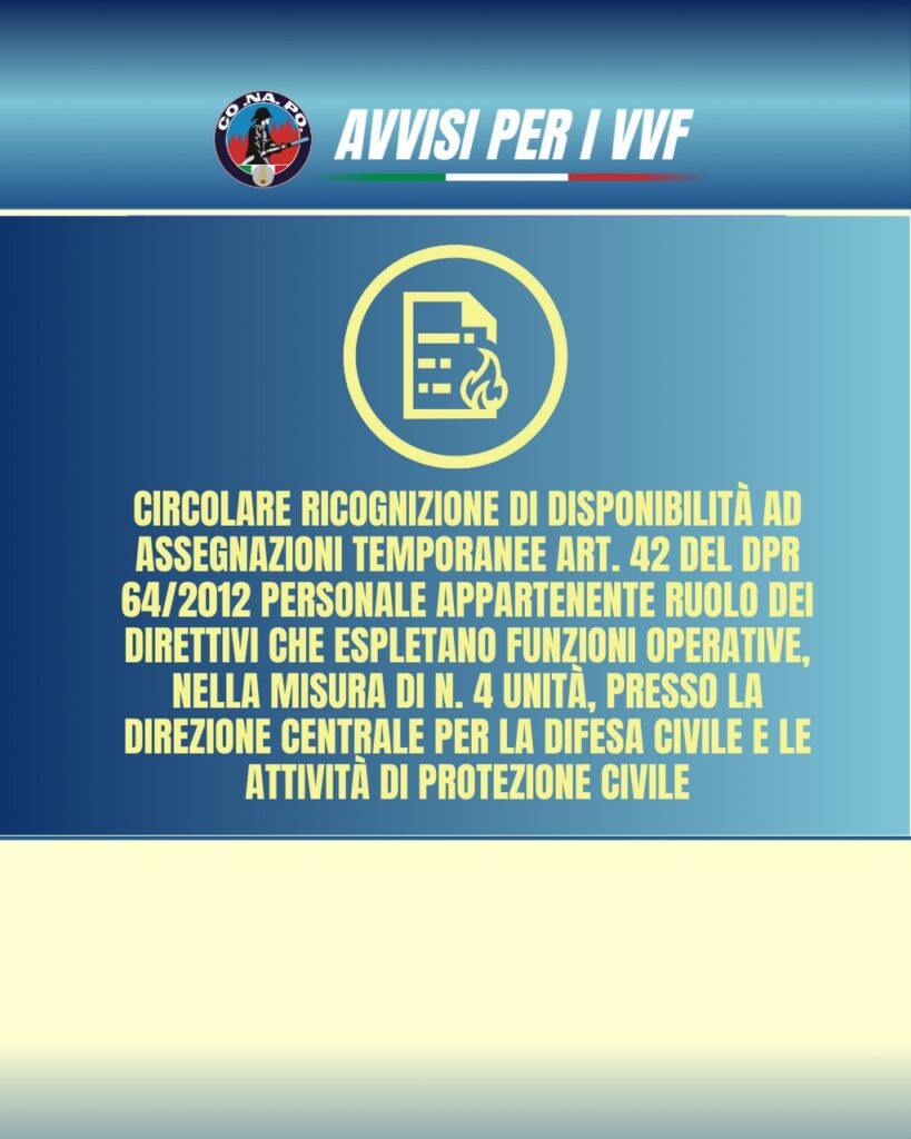 Assegnazione temporanea, ai sensi dell´art. 42 del D.P.R. n. 64/2012, di personale appartenente al ruolo dei direttivi che espletano funzioni operative per le esigenze di servizio della Direzione Centrale per la Difesa Civile e le Attività di Protezione Civile. Avvio Interpello
