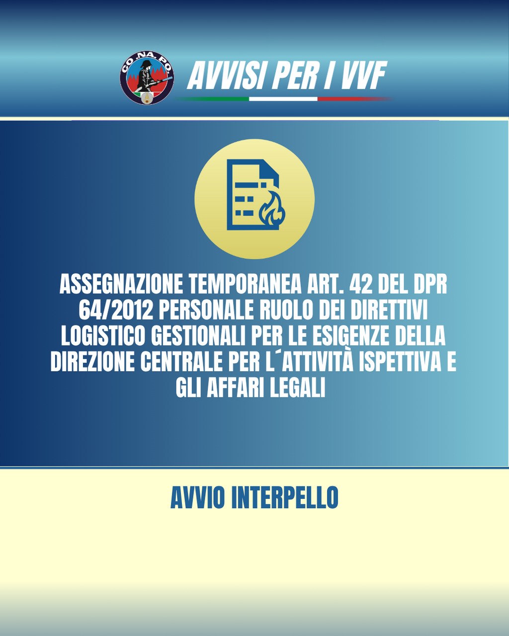Assegnazione temporanea, ai sensi dell’art. 42 del D.P.R. n. 64/2012, di personale appartenente al ruolo dei direttivi logistico gestionali per le esigenze della Direzione Centrale per l’Attività Ispettiva e gli Affari Legali. Avvio interpello.