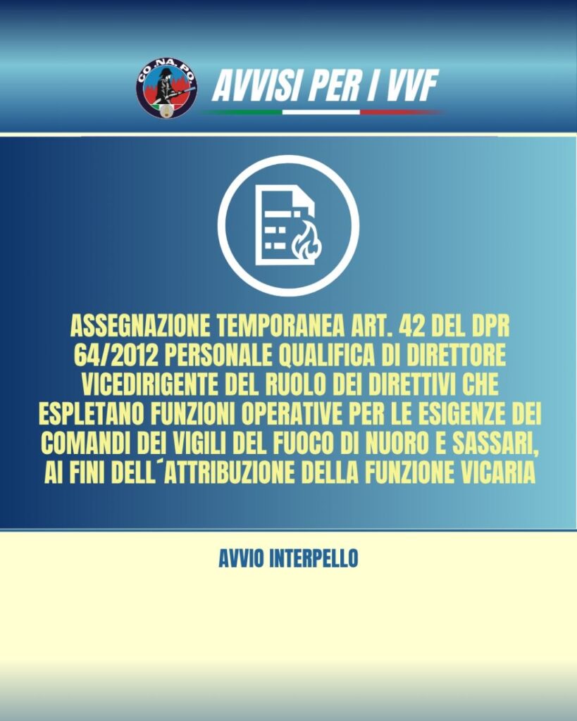 Assegnazione temporanea, ai sensi dell’art. 42 del D.P.R. n. 64/2012, di personale appartenente alla qualifica di Direttore Vicedirigente del ruolo dei Direttivi che espletano funzioni operative per le esigenze dei Comandi dei Vigili del Fuoco di Nuoro e Sassari, ai fini dell’attribuzione della funzione Vicaria. Avvio interpello.