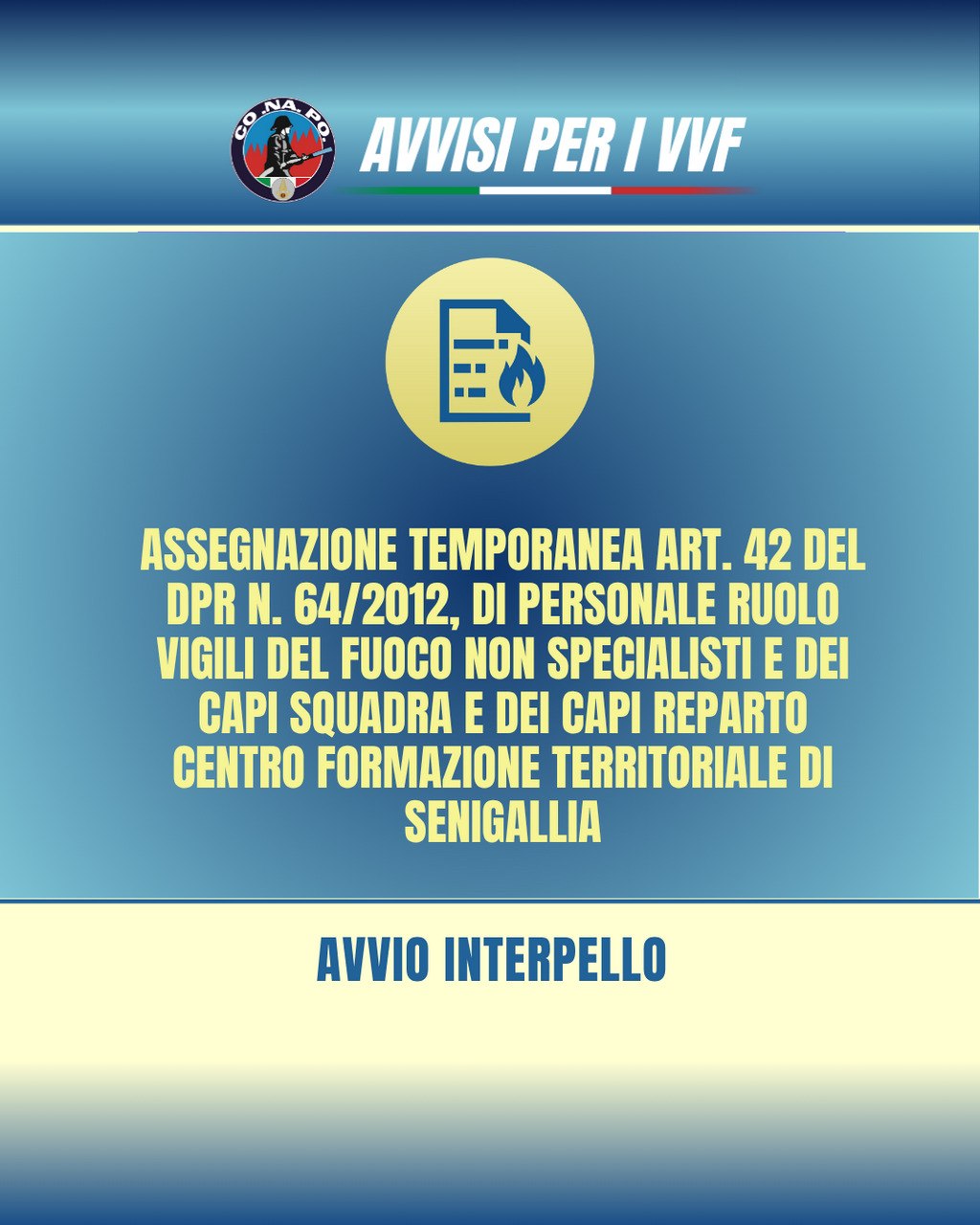 Assegnazione temporanea, ai sensi dell’art. 42 del DPR n. 64/2012, di personale appartenente al ruolo dei Vigili del Fuoco non specialisti e dei Capi Squadra e dei Capi reparto presso il Centro Formazione Territoriale di Senigallia.