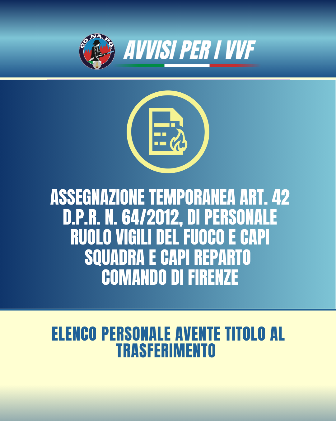 Assegnazione temporanea, ai sensi dell’art. 42 del DPR n. 64/2012, di personale appartenente al ruolo dei Vigili del Fuoco non specialisti e dei Capi Squadra e dei Capi reparto presso il Comando dei Vigili del Fuoco di Firenze.