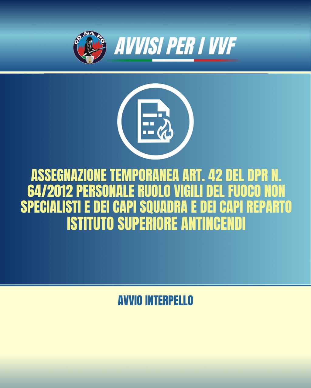 HomeNewsAssegnazione temporanea, ai sensi dell’art. 42 del DPR n. 64/2012, di personale appartenente al ruolo dei Vigili del Fuoco non specialisti e dei Capi Squadra e dei Capi reparto presso l’Istituto Superiore Antincendi.