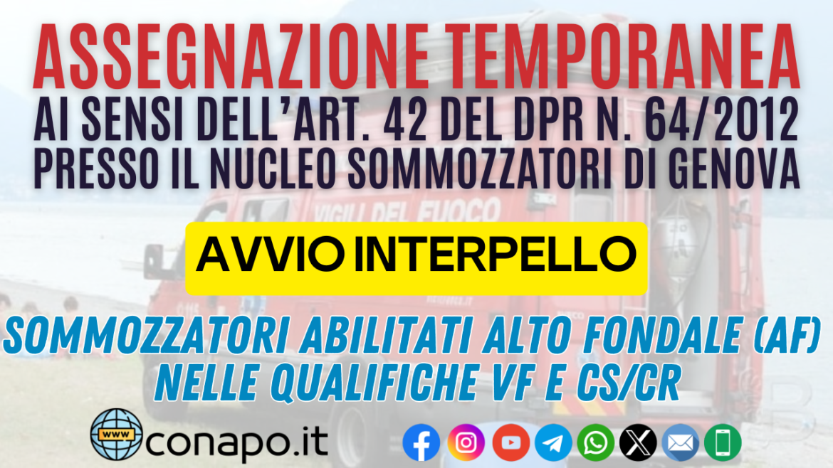 Home News Assegnazione temporanea, ai sensi dell’art. 42 del DPR n. 64/2012, di personale appartenente alla specialità dei Sommozzatori abilitati Alto Fondale (AF) nelle qualifiche dei Vigili del Fuoco, dei Capi Squadra e dei Capi Reparto presso il Nucleo Sommozzatori di Genova – Avvio interpello