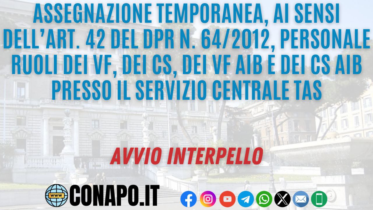 Assegnazione temporanea, ai sensi dell’art. 42 del DPR n. 64/2012, di personale appartenente ai ruoli dei Vigili del Fuoco, dei Capi Squadra, dei Vigili del Fuoco AIB e dei Capi Squadra AIB presso il Servizio Centrale TAS