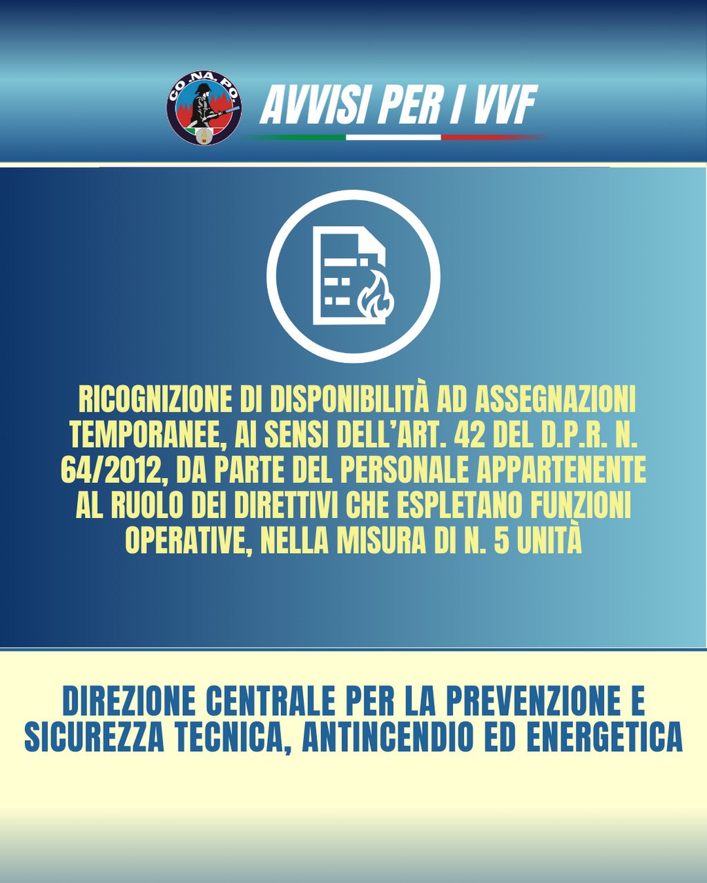 Assegnazione temporanea, ai sensi dell’art. 42 del D.P.R. n. 64/2012, di personale appartenente al ruolo dei direttivi che espletano funzioni operative per le esigenze di servizio della Direzione Centrale per la Prevenzione e Sicurezza Tecnica, Antincendio ed Energetica. Avvio interpello.