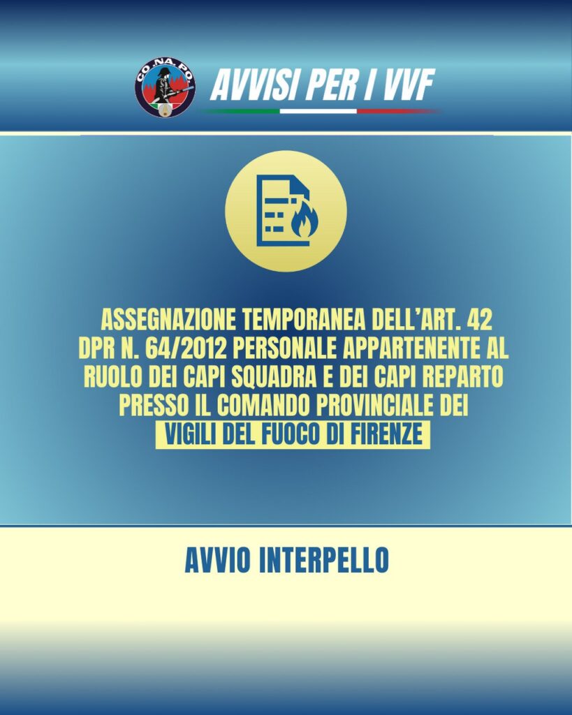 Assegnazione temporanea, ai sensi dell’art. 42 del DPR n. 64/2012, di personale appartenente al ruolo dei Vigili del Fuoco non specialisti e dei Capi Squadra e dei Capi reparto presso il Comando dei Vigili del Fuoco di Firenze. Avvio interpello.