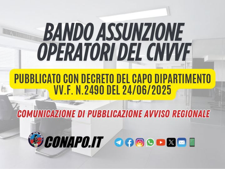 Home News Assunzioni numeriche di 8 unità nella qualifica di operatore nel ruolo degli operatori del Corpo Nazionale dei Vigili del Fuoco – Bando pubblicato con Decreto del Capo Dipartimento VV.F. n. 2490 del 24.06.2025 – Comunicazione di pubblicazione Avviso regionale.