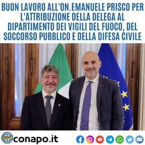 Attribuita al Sottosegretario On. Emanuele Prisco la delega per i Vigili del fuoco. da Redazione_Conapo 30 Novembre 2022 30 Novembre 2022 996 Il Segretario Generale Marco Piergallini con il Sottosegretario Emanuele Prisco Leggi la nota Scarica il PDF Stampa Condividi 0 FacebookTwitterPinterestWhatsappTelegramEmail Potrebbe piacerti anche Elezione dei rappresentanti dei lavoratori per la sicurezza. 16 Dicembre 2025 Consiglio dei Ministri n. 151 – 11 Dicembre 2025 – Proroga termini – Disposizioni... 12 Dicembre 2025 Specialisti di aeromobile – Decreto di inquadramento ed assegnazione sede. 10 Dicembre 2025 Incontro governo-sindacati sulla legge di Bilancio, l’intervento del Segretario Generale Marco Piergallini. 9 Dicembre 2025 Procedura di assunzione di n. 97 unità nella qualifica di operatore nel ruolo degli... 9 Dicembre 2025 Nomina in ruolo dei Vigili del Fuoco appartenenti al 100° corso di formazione teorico-pratico... 9 Dicembre 2025 post precedente 93° corso di formazione per allievi vigili del fuoco e XI corso di formazione per ispettori antincendi in prova vincitori del concorso pubblico – Calendario delle prove d’esame finale. prossimo post Riunione modifica criteri mobilità Ispettori Antincendi (video + comunicato CONAPO).