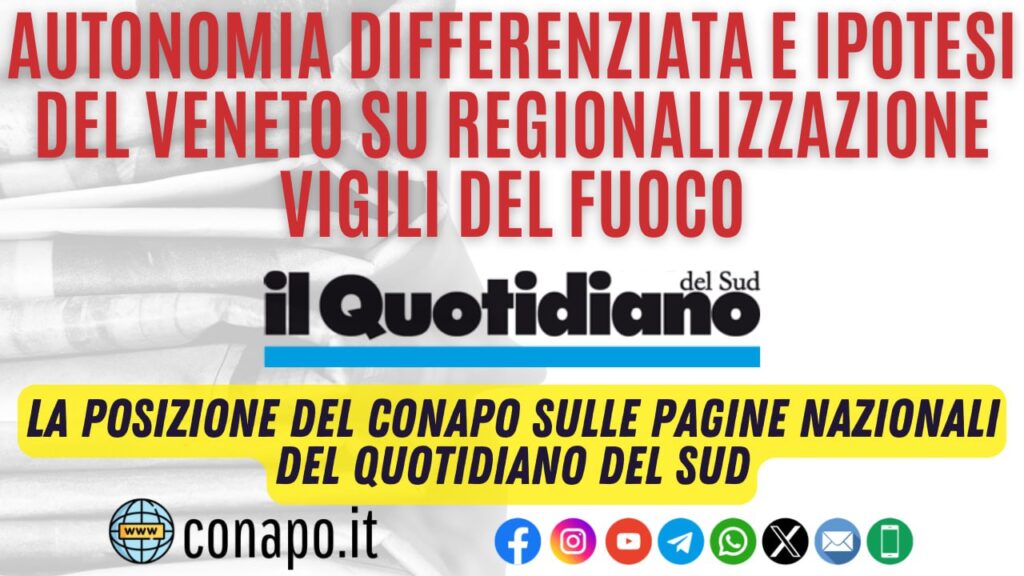 Home Bacheca Sindacale Autonomia differenziata e ipotesi del Veneto su regionalizzazione Vigili del Fuoco, Piantedosi batta un colpo! La posizione del Conapo sulle pagine nazionali del  Quotidiano del Sud.