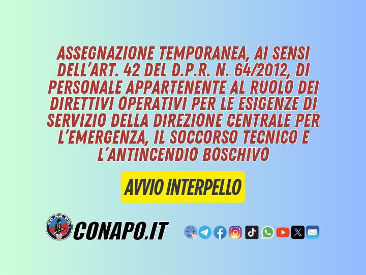 Avvio Interpello Assegnazione temporanea, ai sensi dell’art. 42 del D.P.R. n. 64/2012, di personale appartenente al ruolo dei direttivi operativi per le esigenze di servizio della Direzione Centrale per l’Emergenza, il Soccorso Tecnico e l’Antincendio Boschivo