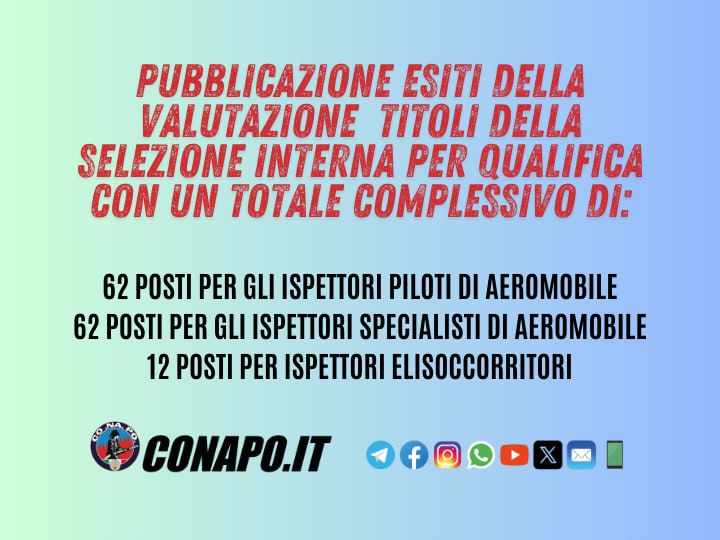 Avviso concernente gli esiti della valutazione dei titoli della selezione interna, per qualifica con un totale complessivo di 62 posti per gli Ispettori piloti di aeromobile; 62 posti per gli Ispettori specialisti di aeromobile; 12 posti per Ispettori elisoccorritori, con decorrenza 2019, 2020, 2021, 2022, 2023 e 2024.
