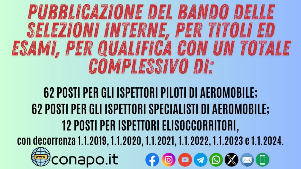 Bando delle selezioni interne, per titoli ed esami, per qualifica con un totale complessivo di 62 posti per gli Ispettori piloti di aeromobile; 62 posti per gli Ispettori specialisti di aeromobile; 12 posti per Ispettori elisoccorritori, con decorrenza 01/01/2019, 01/01/2020, 01/01/2021, 01/01/2022, 01/01/2023, 01/01/2024.