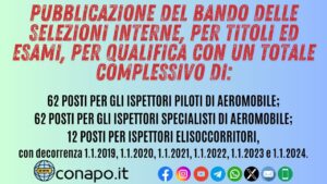 Bando delle selezioni interne per qualifica con un totale complessivo di 62 posti per gli Ispettori piloti di aeromobile; 62 posti per gli Ispettori specialisti di aeromobile; 12 posti per Ispettori elisoccorritori, decorrenza 2019, 2020, 2021, 2022, 2023, 2024.