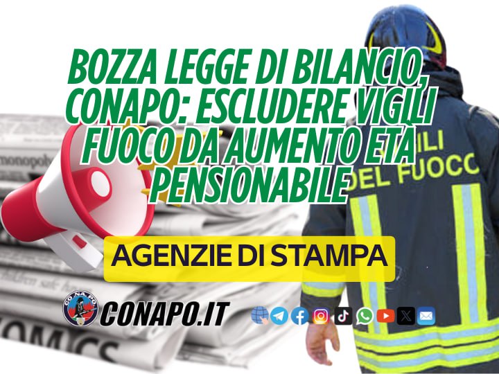 Bozza legge di bilancio, Conapo: escludere vigili fuoco da aumento età pensionabile (agenzie di stampa). da Redazione_Conapo 20 Ottobre 2025 20 Ottobre 2025 683 MANOVRA: CONAPO, ESCLUDERE VIGILI FUOCO DA AUMENTO ETA’ PENSIONABILE Leggi la nota Scarica il PDF Stampa Condividi 0 FacebookTwitterPinterestWhatsappTelegramEmail Potrebbe piacerti anche Screening oncologico e cardiovascolare per il personale in servizio e in quiescenza. 4 Dicembre 2025 Il Governo incontra Forze Armate, Comparto Sicurezza e Soccorso Pubblico. 4 Dicembre 2025 Buona Santa Barbara. 4 Dicembre 2025 Avvio 103° corso Allievi Vigili del Fuoco 3 Dicembre 2025 Procedura di selezione per 18 posti di specialista di aeromobile vigile del fuoco per... 3 Dicembre 2025 Avviso relativo alla “prova pratica tecnica” per l’accertamento dei requisiti attitudinali della selezione interna... 2 Dicembre 2025 post precedente EMILIA ROMAGNA – Grave carenza di organico. Richiesta d’intervento urgente. prossimo post Mobilità e assegnazioni piloti e specialisti di aeromobile. CONAPO chiede intervento urgente.