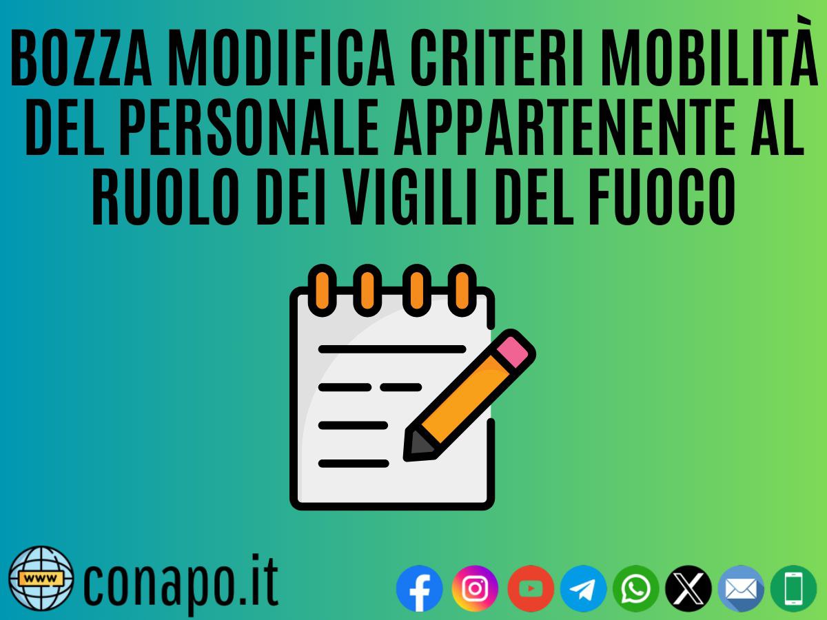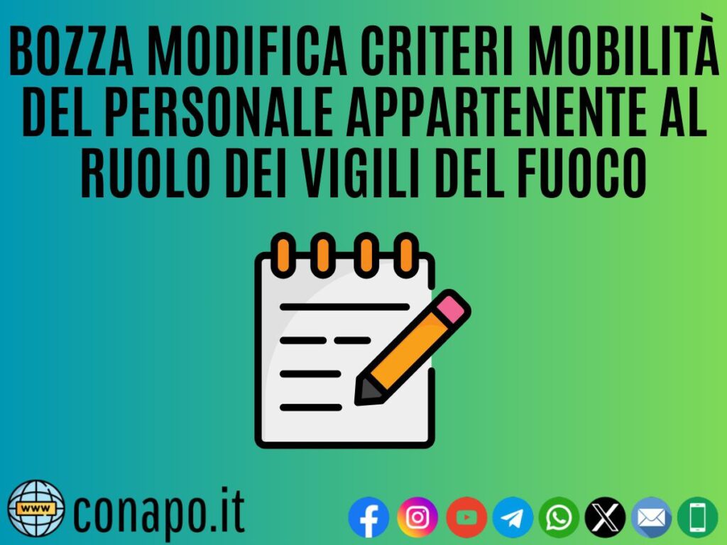 Bozza modifica criteri mobilità del personale appartenente al ruolo dei vigili del fuoco. da Redazione_Conapo 21 Dicembre 2023 21 Dicembre 2023 2,4K Bozza modifica criteri mobilità del personale appartenente al ruolo dei vigili del fuoco Leggi la nota Scarica il PDF Stampa Condividi 0 FacebookTwitterPinterestWhatsappTelegramEmail Potrebbe piacerti anche Pubblicazione graduatorie finali – Concorsi pubblici a 7 posti per l’accesso alla qualifica di... 5 Dicembre 2025 Screening oncologico e cardiovascolare per il personale in servizio e in quiescenza. 4 Dicembre 2025 Il Governo incontra Forze Armate, Comparto Sicurezza e Soccorso Pubblico. 4 Dicembre 2025 Buona Santa Barbara. 4 Dicembre 2025 Avvio 103° corso Allievi Vigili del Fuoco 3 Dicembre 2025 Procedura di selezione per 18 posti di specialista di aeromobile vigile del fuoco per... 3 Dicembre 2025 post precedente Mobilità del personale appartenente al ruolo degli Ispettori Informatici del CNVVF – Decreto di trasferimento. prossimo post Informativa per i Primi Dirigenti e per i Direttivi che espletano funzioni Operative.