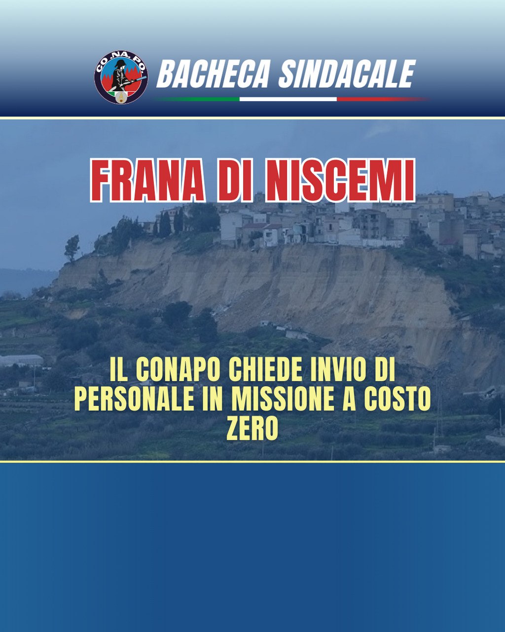 Il CONAPO segnala i gravi danni causati dal ciclone Harry in Sicilia, in particolare a Niscemi (CL), dove una frana ha colpito l’abitato e i Vigili del Fuoco sono impegnati senza sosta nei soccorsi.