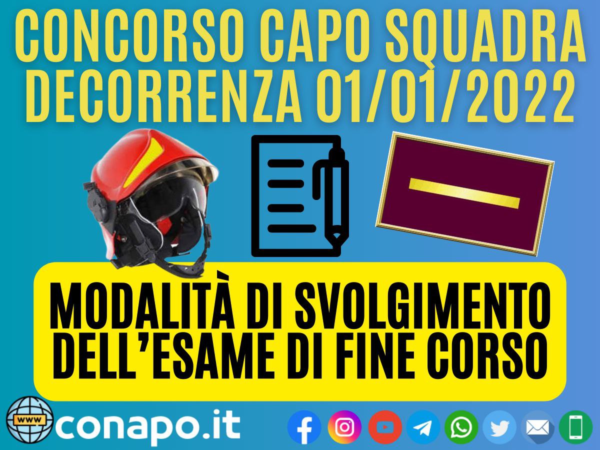 Pubblicazione del decreto delle modalità di svolgimento dell’esame di fine corso di formazione professionale della procedura del concorso interno, per titoli e superamento di un successivo corso di formazione professionale, per la copertura di n. 762 posti complessivi per l’accesso alla qualifica di capo squadra del ruolo dei capi squadra e dei capi reparto, di cui n. 754 da generico e n. 8 da radioriparatore, e di n. 15 posti per l’accesso alla qualifica di capo squadra AIB nel ruolo ad esaurimento dei capi squadra e dei capi reparto AIB del Corpo nazionale dei vigili del fuoco, con decorrenza 1° gennaio 2022.