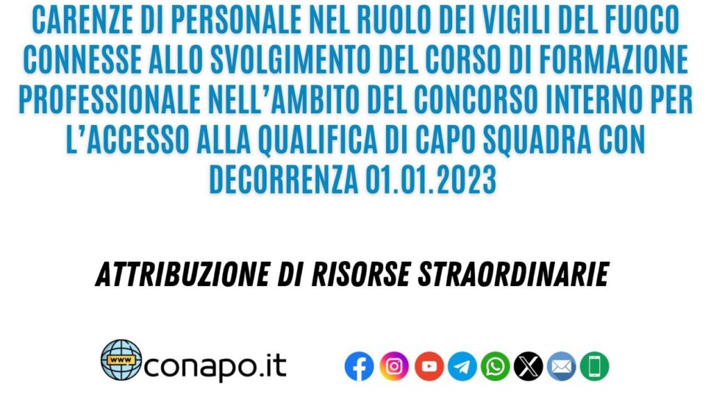 Carenze di personale nel ruolo dei vigili del fuoco connesse allo svolgimento del corso di formazione professionale nell’ambito del concorso interno per l’accesso alla qualifica di capo squadra con decorrenza 01.01.2023 – Attribuzione di risorse straordinarie.