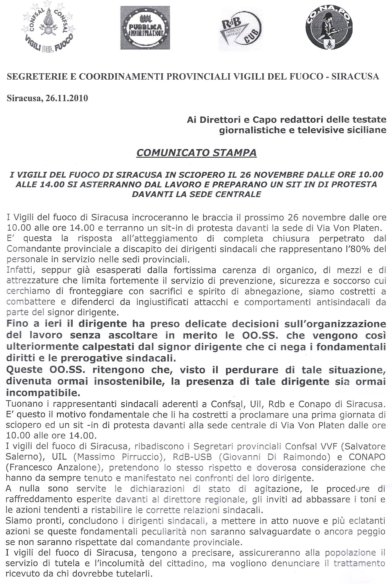 Comunicato stampa sciopero. da CONAPO 26 Novembre 2010 26 Novembre 2010 335 Condividi 0 FacebookTwitterPinterestWhatsappTelegramEmail Potrebbe piacerti anche PRATO – Escrementi di topi e uccelli nella mensa dei vigili del fuoco: proclamato... 2 Dicembre 2025 PERUGIA – Richiesta di intitolazione della sede VV.F. di Perugia alla memoria del Vigile... 28 Novembre 2025 BELLUNO – Il Prefetto accoglie la richiesta CONAPO dopo la segnalazione in merito alla... 24 Novembre 2025 RIMINI – Urgente ripristino impianto di climatizzazione presso distaccamento di Cattolica. 23 Novembre 2025 REGGIO EMILIA – Mozione ordinaria per il Consiglio comunale, carenza organico dei Vigili del... 21 Novembre 2025 REGGIO EMILIA – i motivi dello stato di agitazione CONAPO (video). 21 Novembre 2025 post precedente Circolare VVF su trasmissione per via telematica certificati di malattia. prossimo post Circolare VVF su carenza personale qualificato.
