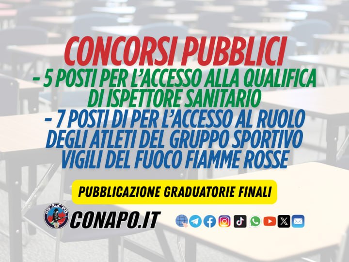 Concorsi pubblici a 5 posti per l’accesso alla qualifica di ispettore sanitario e a 7 posti di per l’accesso al ruolo degli atleti del gruppo sportivo vigili del fuoco Fiamme Rosse. Pubblicazione graduatorie finali.