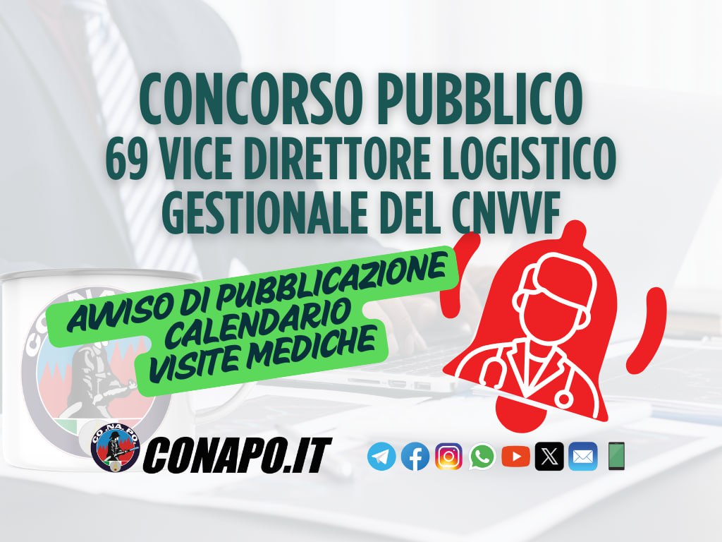 Concorso a 69 posti di Vice Direttore Logistico Gestionale – Avviso visite mediche. da Redazione_Conapo 6 Agosto 2025 6 Agosto 2025 587 Leggi la nota Scarica il PDF Stampa Condividi 0 FacebookTwitterPinterestWhatsappTelegramEmail Potrebbe piacerti anche Pubblicazione graduatorie finali – Concorsi pubblici a 7 posti per l’accesso alla qualifica di... 5 Dicembre 2025 Screening oncologico e cardiovascolare per il personale in servizio e in quiescenza. 4 Dicembre 2025 Il Governo incontra Forze Armate, Comparto Sicurezza e Soccorso Pubblico. 4 Dicembre 2025 Buona Santa Barbara. 4 Dicembre 2025 Avvio 103° corso Allievi Vigili del Fuoco 3 Dicembre 2025 Procedura di selezione per 18 posti di specialista di aeromobile vigile del fuoco per... 3 Dicembre 2025 post precedente Concorso pubblico a 69 posti di vice direttore logistico gestionale – Rettifica graduatoria finale. prossimo post Concorso a 23 posti di Vice Direttore Informatico – Avviso esiti prova scritta.