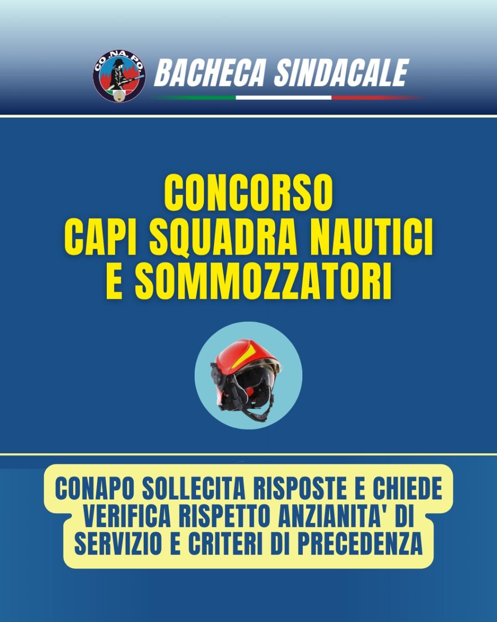 HomeBacheca SindacaleConcorso Capi Squadra nautici e sommozzatori, Conapo sollecita risposte e chiede verifica su anzianità di servizio e criteri di precedenza.