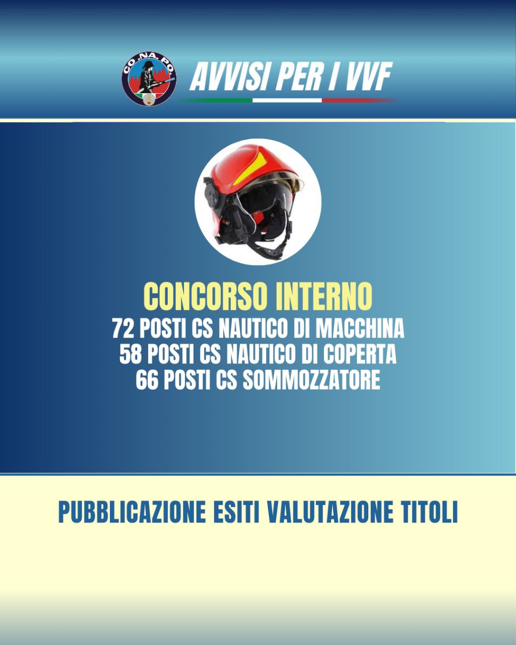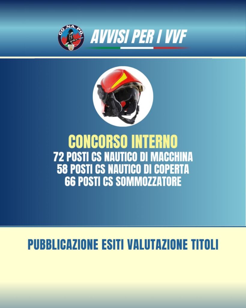 AVVISO DI PUBBLICAZIONE DEGLI ESITI DELLA VALUTAZIONE DEI TITOLI DEL CONCORSO INTERNO, PER TITOLI E SUPERAMENTO DI UN SUCCESSIVO CORSO DI FORMAZIONE PROFESSIONALE, PER LA COPERTURA DI N. 72 POSTI COMPLESSIVI PER L’ACCESSO ALLA QUALIFICA DI NAUTICO DI MACCHINA CAPO SQUADRA, N. 58 POSTI COMPLESSIVI PER L’ACCESSO ALLA QUALIFICA DI NAUTICO DI COPERTA E N. 66 POSTI COMPLESSIVI PER L’ACCESSO ALLA QUALIFICA DI SOMMOZZATORE CAPO SQUADRA DEL CORPO NAZIONALE DEI VIGILI DEL FUOCO, DECORRENZA 1° GENNAIO 2021, 1° GENNAIO 2022, 1° GENNAIO 2023, 1° GENNAIO 2024 E 1° GENNAIO 2025.