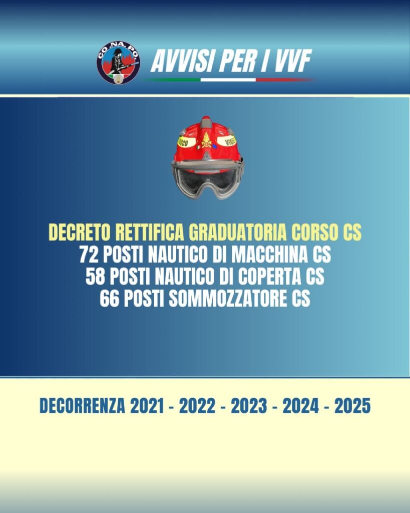 AVVISO DI PUBBLICAZIONE DEL DECRETO DI RETTIFICA DELL’APPROVAZIONE DELLA GRADUATORIA PER LA SUCCESSIVA AMMISSIONE AL CORSO DI FORMAZIONE PROFESSIONALE DELLA PROCEDURA CONCORSUALE INTERNA, PER TITOLI E SUPERAMENTO DI UN SUCCESSIVO CORSO DI FORMAZIONE PROFESSIONALE, PER LA COPERTURA DI N.72 POSTI COMPLESSIVI PER L’ACCESSO ALLA QUALIFICA DI NAUTICO DI MACCHINA CAPO SQUADRA , N. 58 POSTI COMPLESSIVI PER L’ACCESSO ALLA QUALIFICA DI NAUTICO DI COPERTA CAPO SQUADRA E N. 66 POSTI COMPLESSIVI PER L’ACCESSO ALLA QUALIFICA DI SOMMOZZATORE CAPO SQUADRA DEL CORPO NAZIONALE DEI VIGILI DEL FUOCO, DECORRENZA 1° GENNAIO 2021, 1° GENNAIO 2022, 1° GENNAIO 2023, 1° GENNAIO 2024 E 1° GENNAIO 2025.