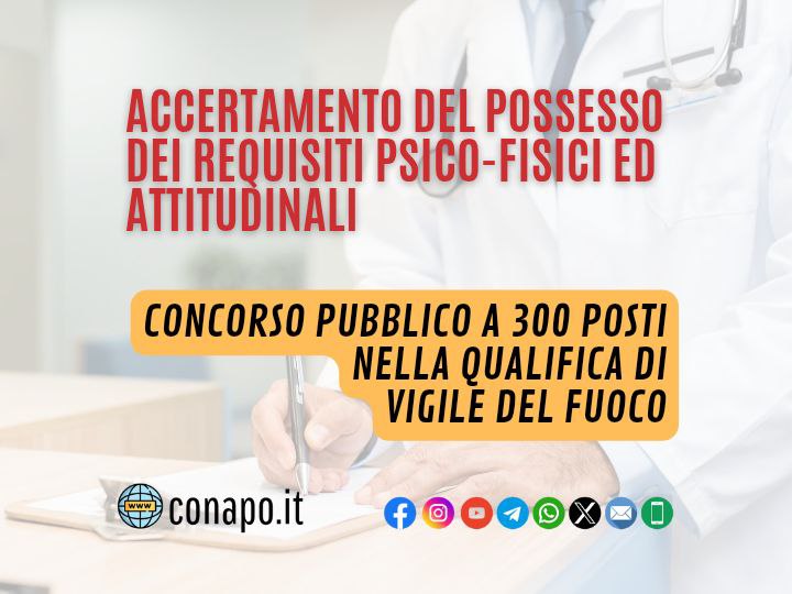 Concorso pubblico a 300 posti nella qualifica di vigile del fuoco del C.N.VV.F. – accertamenti di idoneità psico-fisica ed attitudinale. da Redazione_Conapo 14 Aprile 2025 14 Aprile 2025 1,9K Concorso pubblico, per titoli ed esami, a 300 posti nella qualifica di vigile del fuoco del C.N.VV.F. – accertamenti di idoneità psico-fisica ed attitudinale. Leggi la nota Scarica il PDF Stampa Condividi 0 FacebookTwitterPinterestWhatsappTelegramEmail Potrebbe piacerti anche Attribuzione degli scatti convenzionali al 31 dicembre 2024 a favore del personale del Corpo... 17 Dicembre 2025 Elezione dei rappresentanti dei lavoratori per la sicurezza. 16 Dicembre 2025 Consiglio dei Ministri n. 151 – 11 Dicembre 2025 – Proroga termini – Disposizioni... 12 Dicembre 2025 Specialisti di aeromobile – Decreto di inquadramento ed assegnazione sede. 10 Dicembre 2025 Incontro governo-sindacati sulla legge di Bilancio, l’intervento del Segretario Generale Marco Piergallini. 9 Dicembre 2025 Procedura di assunzione di n. 97 unità nella qualifica di operatore nel ruolo degli... 9 Dicembre 2025 post precedente Il soccorso pubblico è competenza dello Stato. prossimo post Ricognizione ai sensi dell’art.42 DPR 64/2012 di personale appartenente al ruolo degli Operatori e degli Assistenti per assegnazioni temporanee presso il Comando VV.F di La Spezia per le esigenze della CMO – Avvio Interpello.