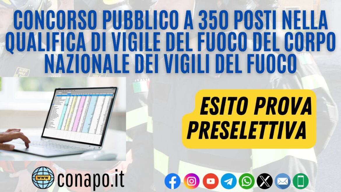 Concorso pubblico a 350 posti nella qualifica di vigile del fuoco del Corpo nazionale dei vigili del fuoco – Esiti prova preselettiva. da Redazione_Conapo 11 Novembre 2024 11 Novembre 2024 16,1K Concorso pubblico, per titoli ed esami, a 350 posti nella qualifica di vigile del fuoco del Corpo nazionale dei vigili del fuoco – Avviso Esiti Prova Preselettiva. Leggi la nota Scarica il PDF Stampa Condividi 0 FacebookTwitterPinterestWhatsappTelegramEmail Potrebbe piacerti anche Pubblicazione graduatorie finali – Concorsi pubblici a 7 posti per l’accesso alla qualifica di... 5 Dicembre 2025 Screening oncologico e cardiovascolare per il personale in servizio e in quiescenza. 4 Dicembre 2025 Il Governo incontra Forze Armate, Comparto Sicurezza e Soccorso Pubblico. 4 Dicembre 2025 Buona Santa Barbara. 4 Dicembre 2025 Avvio 103° corso Allievi Vigili del Fuoco 3 Dicembre 2025 Procedura di selezione per 18 posti di specialista di aeromobile vigile del fuoco per... 3 Dicembre 2025 post precedente Al via le operazioni di pagamento accordo sindacale per incremento notturni e Fondo Amministrazione 2021. prossimo post Aggiornamento delle sedi di servizio dei radioriparatori del concorso interno a 1239 posti complessivi per l’accesso alla qualifica di capo squadra, con decorrenza 1° gennaio 2024.