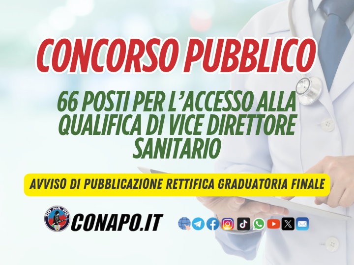 Concorso pubblico a 66 posti di Vice Direttore Sanitario. Avviso pubblicazione rettifica graduatoria finale. da Redazione_Conapo 24 Ottobre 2025 24 Ottobre 2025 614 Concorso pubblico, per titoli ed esami, a 66 posti per l’accesso alla qualifica di Vice Direttore Sanitario. Avviso pubblicazione rettifica graduatoria finale. Leggi la nota Scarica il PDF Stampa Condividi 0 FacebookTwitterPinterestWhatsappTelegramEmail Potrebbe piacerti anche Richiesta parere al Comitato di Verifica per le Cause di Servizio – nuovo modello... 6 Dicembre 2025 Pubblicazione graduatorie finali – Concorsi pubblici a 7 posti per l’accesso alla qualifica di... 5 Dicembre 2025 Screening oncologico e cardiovascolare per il personale in servizio e in quiescenza. 4 Dicembre 2025 Il Governo incontra Forze Armate, Comparto Sicurezza e Soccorso Pubblico. 4 Dicembre 2025 Buona Santa Barbara. 4 Dicembre 2025 Avvio 103° corso Allievi Vigili del Fuoco 3 Dicembre 2025 post precedente Avviso rettifica graduatoria finale – Concorso Pubblico a 69 posti di Vice Direttore Logistico Gestionale prossimo post Pubblicazione dell’avviso relativo agli esiti della prova scritta della selezione interna, per titoli ed esami, per qualifica con un totale complessivo di 62 posti per gli Ispettori piloti di aeromobile; 62 posti per gli Ispettori specialisti di aeromobile; 12 posti per Ispettori elisoccorritori, con decorrenza 1.1.2019, 1.1.2020, 1.1.2021, 1.1.2022, 1.1.2023 e 1.1.2024