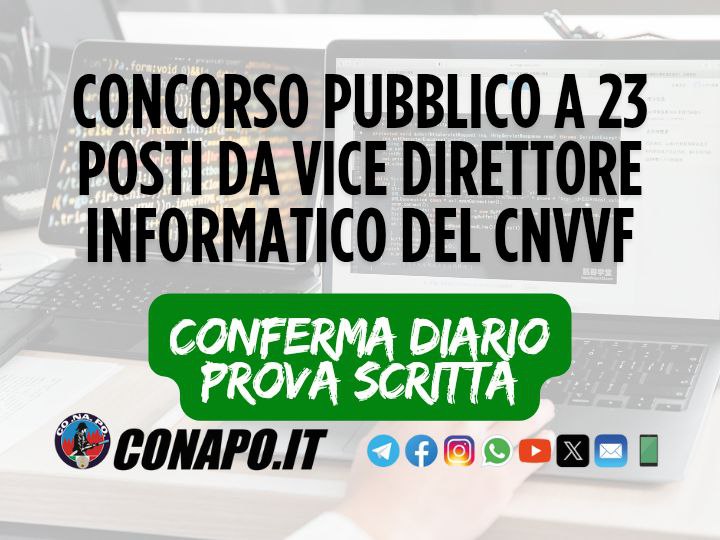 Concorso pubblico, per esami, a 23 posti di vice direttore informatico, conferma prova scritta. da Redazione_Conapo 16 Giugno 2025 16 Giugno 2025 519 Leggi la nota Scarica il PDF Stampa Condividi 0 FacebookTwitterPinterestWhatsappTelegramEmail Potrebbe piacerti anche Pubblicazione graduatorie finali – Concorsi pubblici a 7 posti per l’accesso alla qualifica di... 5 Dicembre 2025 Screening oncologico e cardiovascolare per il personale in servizio e in quiescenza. 4 Dicembre 2025 Il Governo incontra Forze Armate, Comparto Sicurezza e Soccorso Pubblico. 4 Dicembre 2025 Buona Santa Barbara. 4 Dicembre 2025 Avvio 103° corso Allievi Vigili del Fuoco 3 Dicembre 2025 Procedura di selezione per 18 posti di specialista di aeromobile vigile del fuoco per... 3 Dicembre 2025 post precedente BERGAMO – Vigili del fuoco, in Bergamasca è emergenza personale: “Situazione drammatica” (rassegna stampa). prossimo post Concorso pubblico, per esami, a 5 posti di Ispettore Sanitario – Avviso relativo al decreto concernente l’esclusione per mancanza del requisito del limite di età dei candidati.