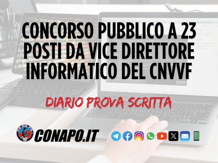 Concorso pubblico, per esami, a 23 posti di vice direttore informatico nel C.N.VV.F. – Diario prova scritta. da Redazione_Conapo 23 Maggio 2025 23 Maggio 2025 535 Leggi la nota Scarica il PDF Stampa Condividi 0 FacebookTwitterPinterestWhatsappTelegramEmail Potrebbe piacerti anche Pubblicazione graduatorie finali – Concorsi pubblici a 7 posti per l’accesso alla qualifica di... 5 Dicembre 2025 Screening oncologico e cardiovascolare per il personale in servizio e in quiescenza. 4 Dicembre 2025 Il Governo incontra Forze Armate, Comparto Sicurezza e Soccorso Pubblico. 4 Dicembre 2025 Buona Santa Barbara. 4 Dicembre 2025 Avvio 103° corso Allievi Vigili del Fuoco 3 Dicembre 2025 Procedura di selezione per 18 posti di specialista di aeromobile vigile del fuoco per... 3 Dicembre 2025 post precedente SARDEGNA – Nucleo SAF – Incarico di Responsabile operativo regionale. prossimo post Legge 23.12.1996 n. 662 – Verifica a campione finalizzata all’accertamento di eventuali attività lavorative extra-istituzionali svolte dai dipendenti del Corpo Nazionale de vigili del fuoco. Indicazioni per l’impiego dell’applicativo web “Verifiche L. 662/96”. Anno di riferimento 2024. Avvio del procedimento.