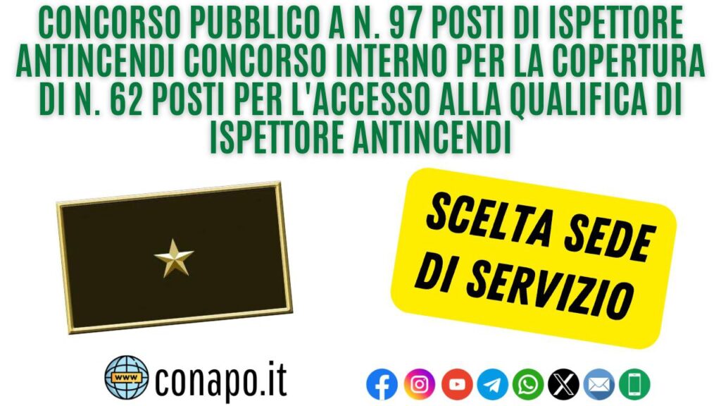 Concorso pubblico, per titoli ed esami, a n. 97 posti di Ispettore Antincendi Concorso interno, per titoli ed esami, per la copertura di n. 62 posti per l’accesso alla qualifica di Ispettore Antincendi – Scelta sede di servizio.