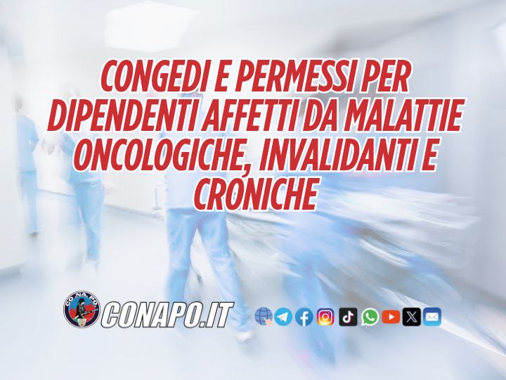 Congedi e permessi per dipendenti affetti da malattie oncologiche, invalidanti e croniche. da Redazione_Conapo 31 Ottobre 2025 31 Ottobre 2025 380 Novità in materia di tutele per lavoratori dipendenti del settore pubblico e privato affetti da malattie oncologiche, invalidanti o croniche, anche rare, con un grado di invalidità pari o superiore a l 74% 👇 Leggi la nota Scarica il PDF Stampa Condividi 0 FacebookTwitterPinterestWhatsappTelegramEmail Potrebbe piacerti anche Richiesta parere al Comitato di Verifica per le Cause di Servizio – nuovo modello... 6 Dicembre 2025 Pubblicazione graduatorie finali – Concorsi pubblici a 7 posti per l’accesso alla qualifica di... 5 Dicembre 2025 Screening oncologico e cardiovascolare per il personale in servizio e in quiescenza. 4 Dicembre 2025 Il Governo incontra Forze Armate, Comparto Sicurezza e Soccorso Pubblico. 4 Dicembre 2025 Buona Santa Barbara. 4 Dicembre 2025 Avvio 103° corso Allievi Vigili del Fuoco 3 Dicembre 2025 post precedente Articolo 6 del decreto legge 30 giugno 2025, n. 95, convertito, con modificazioni, dalla legge 8 agosto 2025, n. 118. Integrazione al reddito per le lavoratrici madri con due o più figli (c.d. Nuovo bonus mamme). Istruzioni contabili. Variazioni al piano dei conti. prossimo post Circolare ricognitiva per l’individuazione di personale dei ruoli dei Vigili del Fuoco, dei Capi Squadra e dei Capi Reparto disponibili a prestare servizio nei Presidi antincendio presso gli Organi Costituzionali.