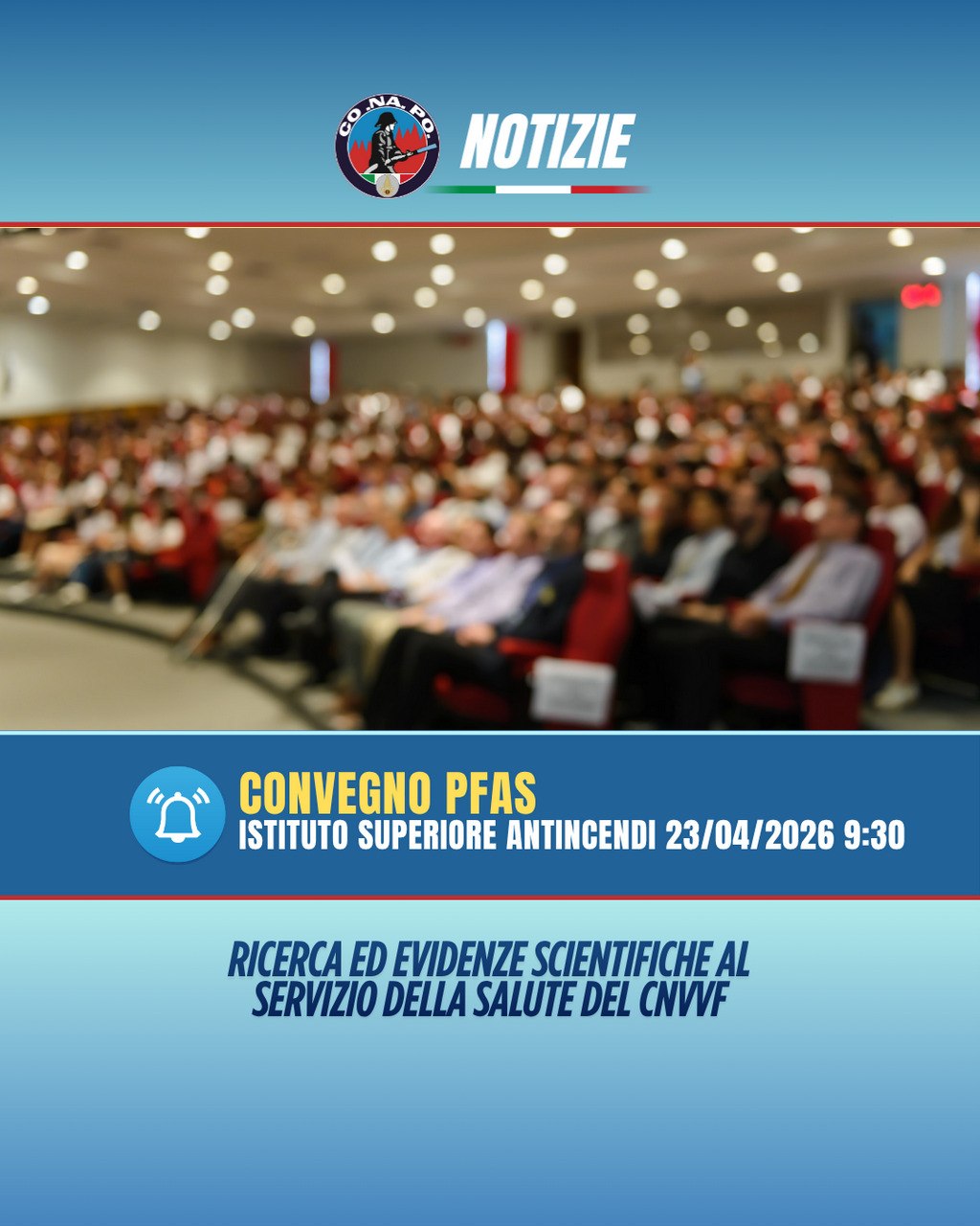 Convegno PFAS ricerca ed evidenze scientifiche al servizio della salute nel CNVVF. da Redazione_Conapo 15 Aprile 2026 15 Aprile 2026 39 23 Aprile 2026 ore 9:30 Leggi la nota Scarica il PDF Stampa Condividi 0 FacebookTwitterPinterestWhatsappTelegramEmail Potrebbe piacerti anche Assegnazione temporanea, ai sensi dell’art. 42 del DPR n. 64/2012, di personale appartenente al... 15 Aprile 2026 Assegnazione temporanea, ai sensi dell’art. 42 del DPR n. 64/2012, di personale appartenente al... 15 Aprile 2026 Attività di formazione esterna del personale dei ruoli sanitari e tecnico-scientifici del CNVVF. Personale... 15 Aprile 2026 Convocazione tavolo tecnico per la programmazione didattica – bozze circolari “Corsi per istruttori professionali”,... 15 Aprile 2026 Informativa relativa alla conferma di incarichi dirigenziali a Dirigenti Generali del Corpo Nazionale dei... 14 Aprile 2026 Riduzione a 5 settimane corso CS nautici e sommozzatori, il Dipartimento ha risposto al... 14 Aprile 2026 post precedente Convocazione tavolo tecnico per la programmazione didattica – bozze circolari “Corsi per istruttori professionali”, “Corsi di formazione di base” e “Corsi N.I.A.” – inviare osservazioni a nazionale@conapo.it prossimo post Attività di formazione esterna del personale dei ruoli sanitari e tecnico-scientifici del CNVVF. Personale medico, infermieristico, psicologo e biologo.