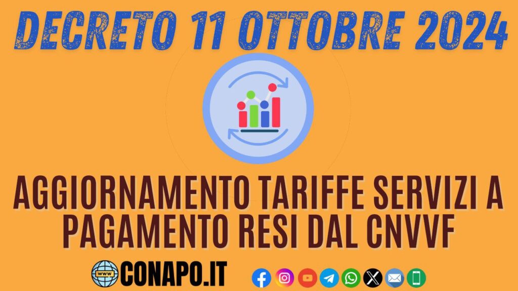 DECRETO 11 ottobre 2024 – Aggiornamento tariffe servizi a pagamento resi dal Corpo nazionale dei vigili del fuoco. da Redazione_Conapo 24 Ottobre 2024 24 Ottobre 2024 3,2K Leggi la nota Scarica il PDF Stampa Condividi 0 FacebookTwitterPinterestWhatsappTelegramEmail Potrebbe piacerti anche Consiglio dei Ministri n. 151 – 11 Dicembre 2025 – Proroga termini – Disposizioni... 12 Dicembre 2025 Specialisti di aeromobile – Decreto di inquadramento ed assegnazione sede. 10 Dicembre 2025 Incontro governo-sindacati sulla legge di Bilancio, l’intervento del Segretario Generale Marco Piergallini. 9 Dicembre 2025 Procedura di assunzione di n. 97 unità nella qualifica di operatore nel ruolo degli... 9 Dicembre 2025 Nomina in ruolo dei Vigili del Fuoco appartenenti al 100° corso di formazione teorico-pratico... 9 Dicembre 2025 Concorso pubblico a 52 posti per l’accesso alla qualifica di Ispettore logistico gestionale del... 9 Dicembre 2025 post precedente Caratteristiche e modalità di uso delle uniformi ordinaria e da gala del personale del Corpo nazionale dei vigili del fuoco. prossimo post TERAMO – Richiesta incontro con le OO.SS. rappresentative del CNVVF.