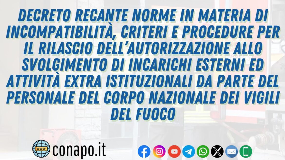 Home News Decreto della Direzione Centrale per le Risorse Umane  recante norme in materia di incompatibilità, criteri e procedure per il rilascio dell’autorizzazione allo svolgimento di incarichi esterni ed attività extra istituzionali da parte del personale del CNVVF.