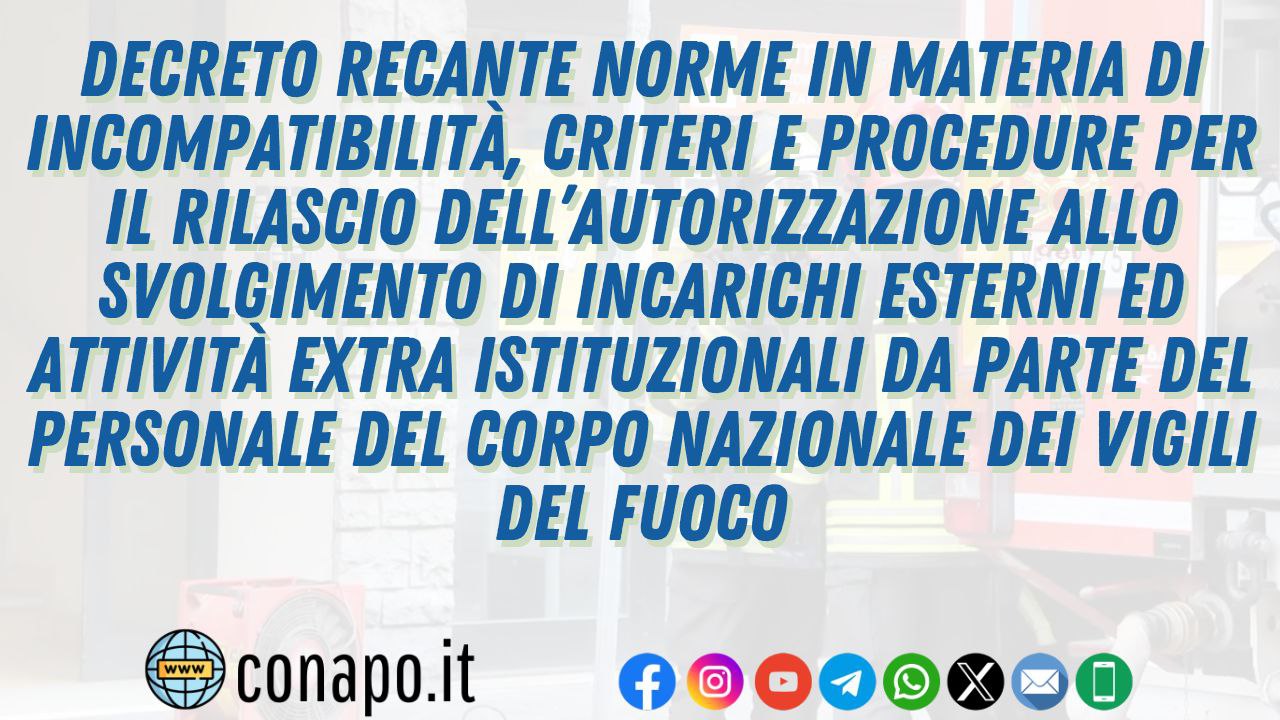 Decreto della Direzione Centrale per le Risorse Umane recante norme in materia di incompatibilità, criteri e procedure per il rilascio dell’autorizzazione allo svolgimento di incarichi esterni ed attività extra istituzionali da parte del personale del CNVVF.