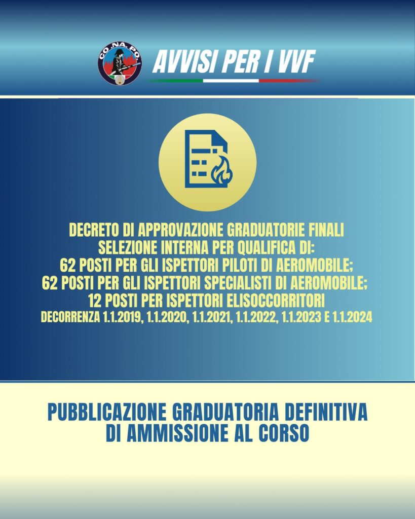 Decreto dipartimentale n. 351 del 21 gennaio 2026. Approvazione delle graduatorie finali della selezione interna, per titoli ed esami, per qualifica con un totale complessivo di 62 posti per gli Ispettori piloti di aeromobile; 62 posti per gli Ispettori specialisti di aeromobile; 12 posti per Ispettori elisoccorritori, con decorrenza 1.1.2019, 1.1.2020, 1.1.2021, 1.1.2022, 1.1.2023 e 1.1.2024