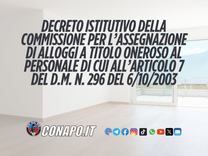 Decreto istitutivo della Commissione per l’assegnazione di alloggi a titolo oneroso al personale di cui all’articolo 7 del D.M. 6 ottobre 2003, n. 296.