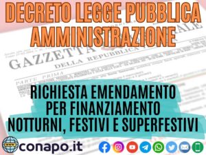 Tanto sopra premesso, con la presente il CONAPO, la più rappresentativa organizzazione sindacale del Corpo nazionale dei vigili del fuoco, chiede alle SS.LL. di adoperarsi per un apposito EMENDAMENTO mirato a incrementare la misura della retribuzione per i servizi notturni, festivi e per le particolari festività, in modo da eliminare le differenze di trattamento rispetto agli altri Corpi dello Stato.