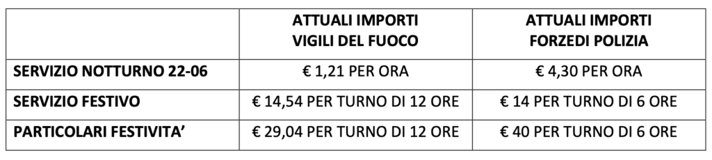Il personale appartenente al Corpo nazionale dei vigili del fuoco, risulta avere un trattamento retributivo accessorio di molto inferiore a quello delle Forze di polizia per quanto riguarda il servizio espletato in orario notturno, festivo e nelle particolari festività (Capodanno, Pasqua, Festa del lavoro, Ferragosto, Natale e Santa Barbara).