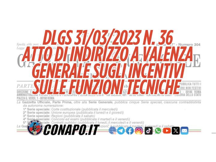 Decreto Legislativo 31 marzo 2023, n. 36 e ss.mm.ii. – Atto di indirizzo a valenza generale sugli incentivi alle funzioni tecniche.